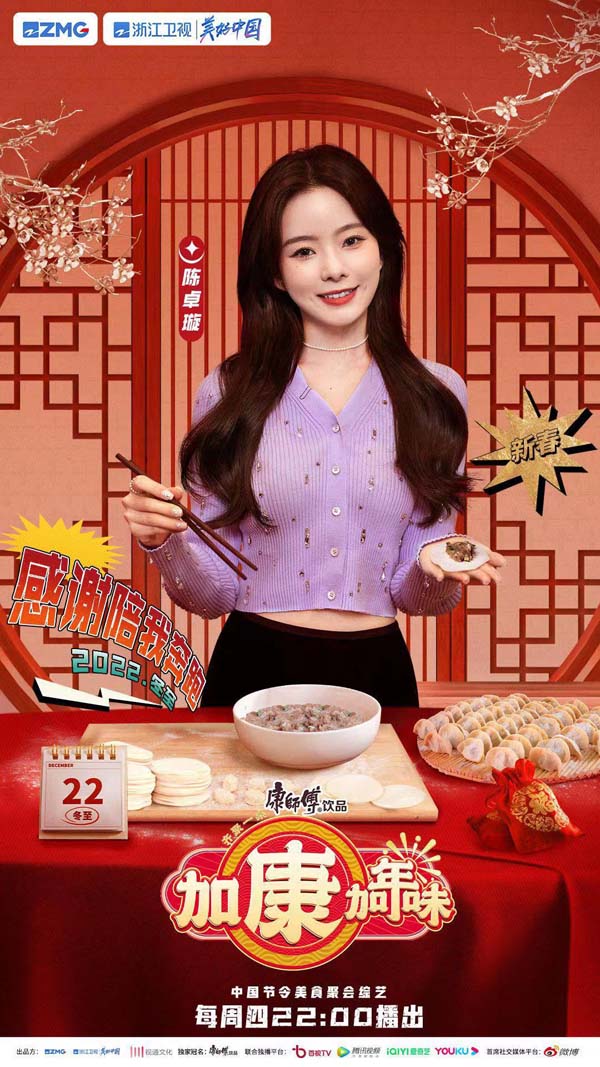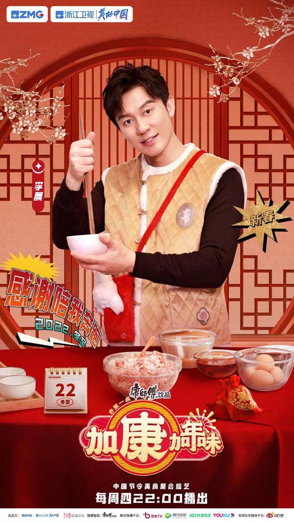 由浙江卫视与浙江视通文化传播有限公司联合出品的中国节令美食青春聚会真人秀——康师傅饮品《加康加年味》将于今天22点在浙江卫视播出。以热播综艺安康庆团圆为主题,邀请《奔跑吧》《天赐的声音》《听说很好吃》《中国好声音》四组嘉宾,在冬至、腊八、小寒、小年,创作四个不同主题的节令团圆饭。在饭局游戏中,讲出彼此故事,开启对新春的祝福。整季节目共四期,将用四个节令串联起辞旧迎新的浓浓年味。